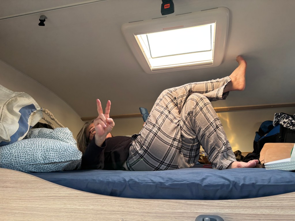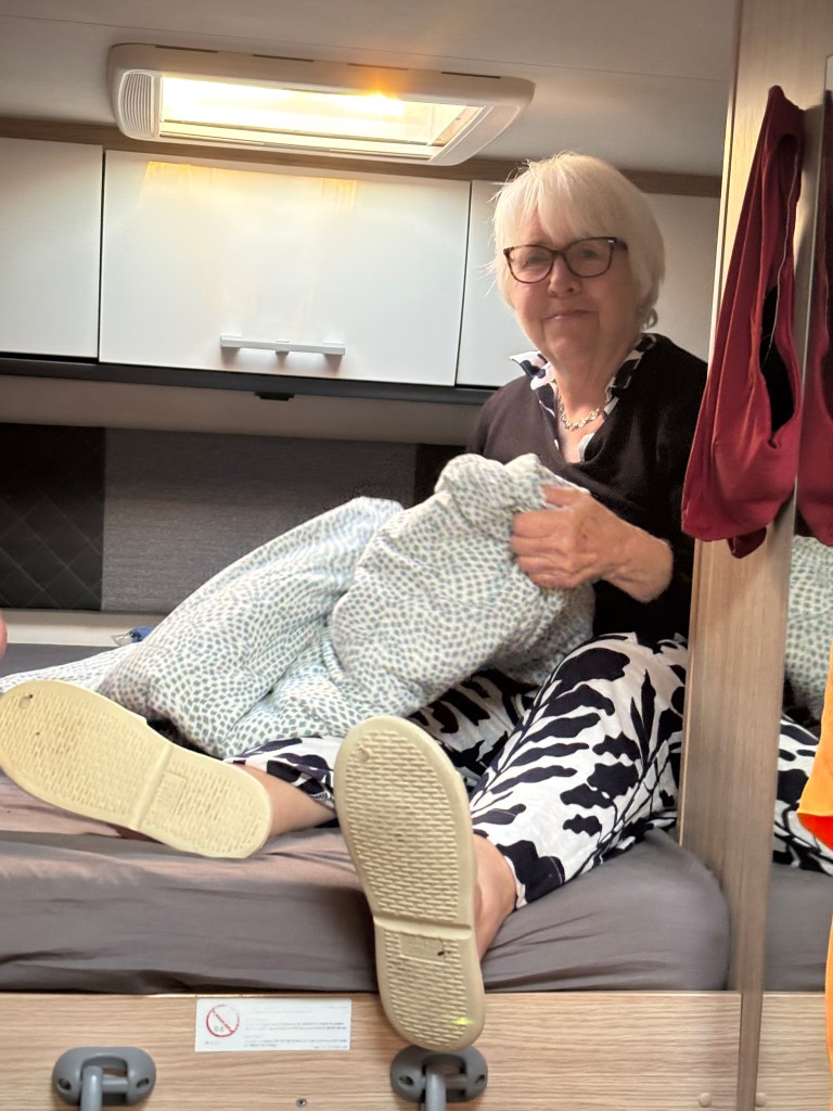 Mary, has to climb an aluminum staircase to get to her bed in the rear. Jane is living large over the cab And I am living on the breakdown table in the kitchen.
