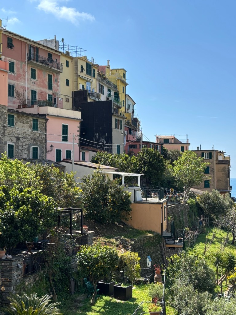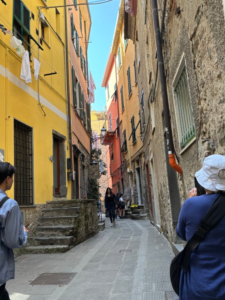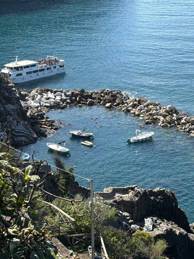 First Riomaggorie, off the train with a long, slow incline up to the very top for the best views. The Mediterranean has never looked this blue. Local fisherman working hand lines from their boats while ferrys carrying tourists travel up and down the shoreline.